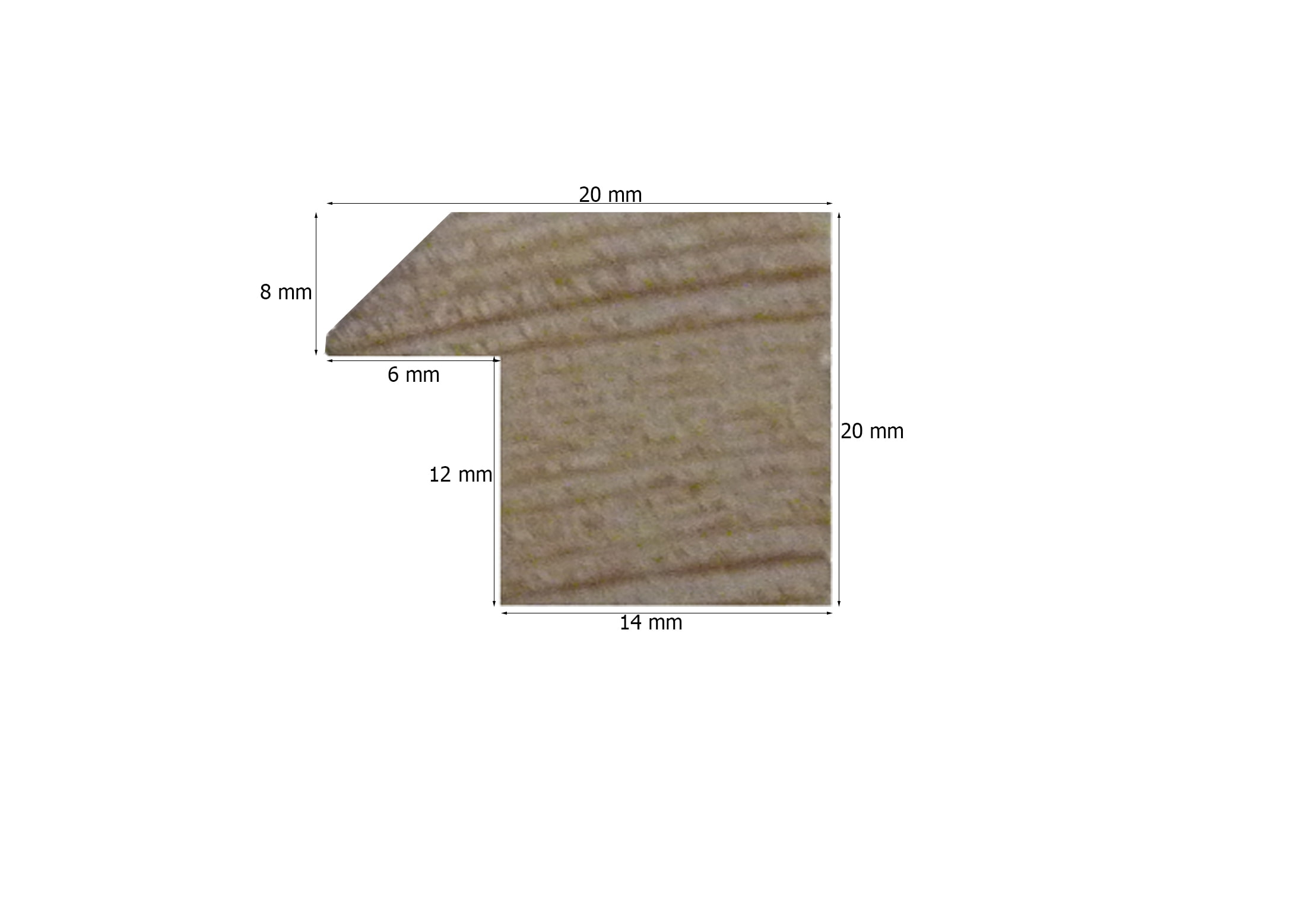 Con un perfil prácticamente cuadrado de 20 mm de ancho × 20 mm de alto, el marco ofrece una presencia equilibrada y discreta. Sus proporciones contenidas son ideales para piezas de formato pequeño a mediano: marcos para fotografías familiares, certificados, láminas artísticas o dibujos que requieren un acabado definido pero sin sobresalir en la pared.