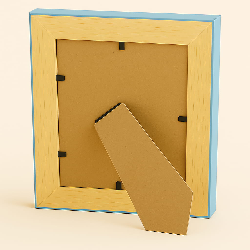 En la parte trasera incorpora un pie de MDF crudo, pensado para uso en sobremesa. Este portafoto no es colgable, por lo que está diseñado para apoyarse sobre mesas, escritorios, estanterías o aparadores. Asimismo, permite orientación tanto en posición vertical como horizontal, adaptándose al formato de la imagen.