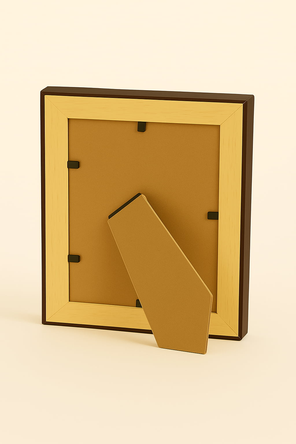 La parte trasera dispone de un pie de MDF crudo, diseñado exclusivamente para uso en sobremesa, por lo que este modelo no está concebido para colgarse en pared. Es ideal para colocarse sobre mesas, escritorios, estanterías o aparadores. Además, permite su colocación tanto en posición vertical como horizontal, adaptándose al formato de la obra o a la composición visual que desees mostrar.